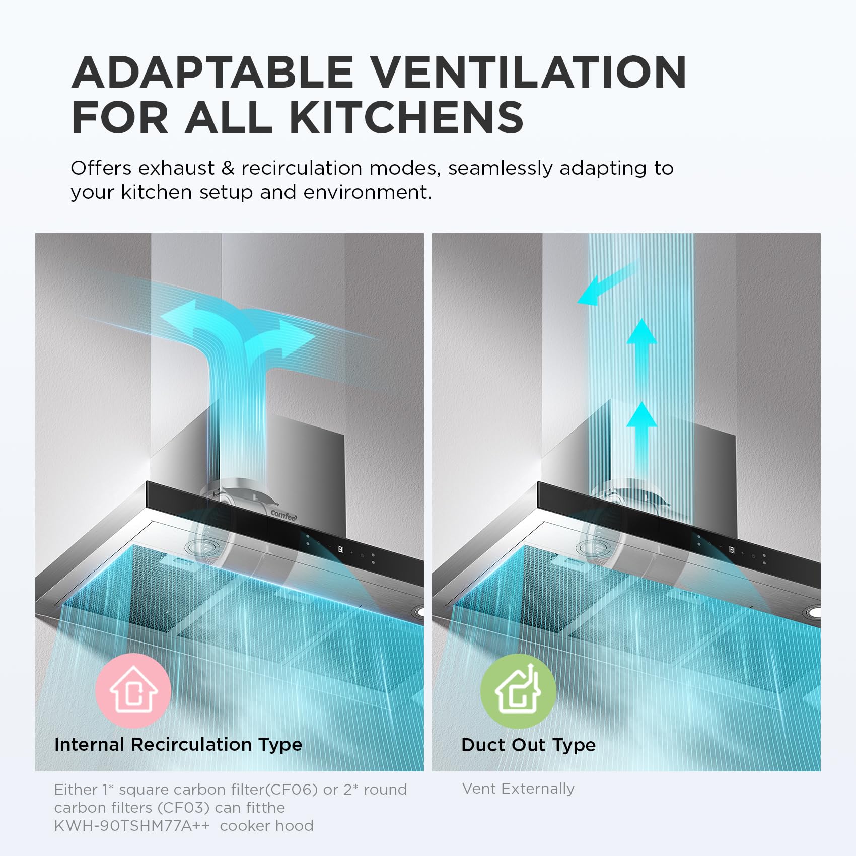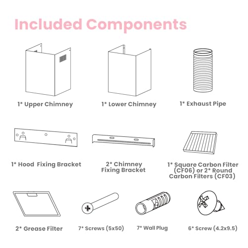 - 【What’s In The Box】 This Cooker Hood package includes Aluminum Grease Filter, Adjustable Stainless Steel Decorative Cover, Screw Pack, and 1 Pack of Square Carbon Filter (CF06) or 2 Packs of Round Carbon Filter Kits (CF03).