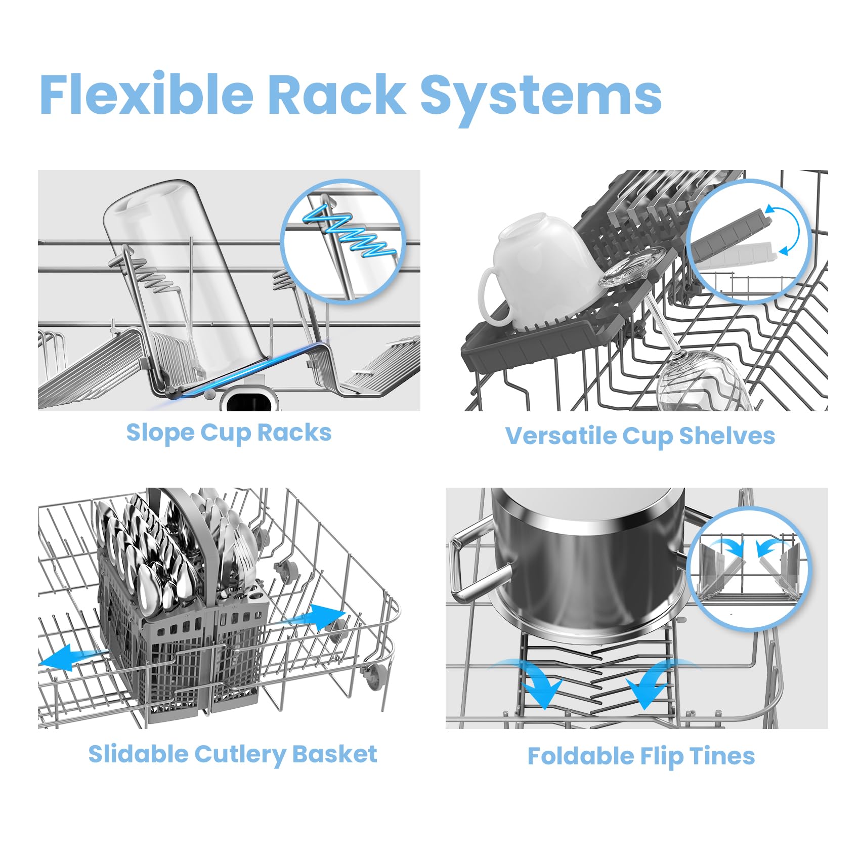 - 【Flexible Rack System】Loading is a breeze with the flexible rack system which includes; foldable flip tines, a removable cutlery basket and versatile cup shelves. This means you have more space for larger dishes, pans and bowls, as well as glasses, mugs and cups
