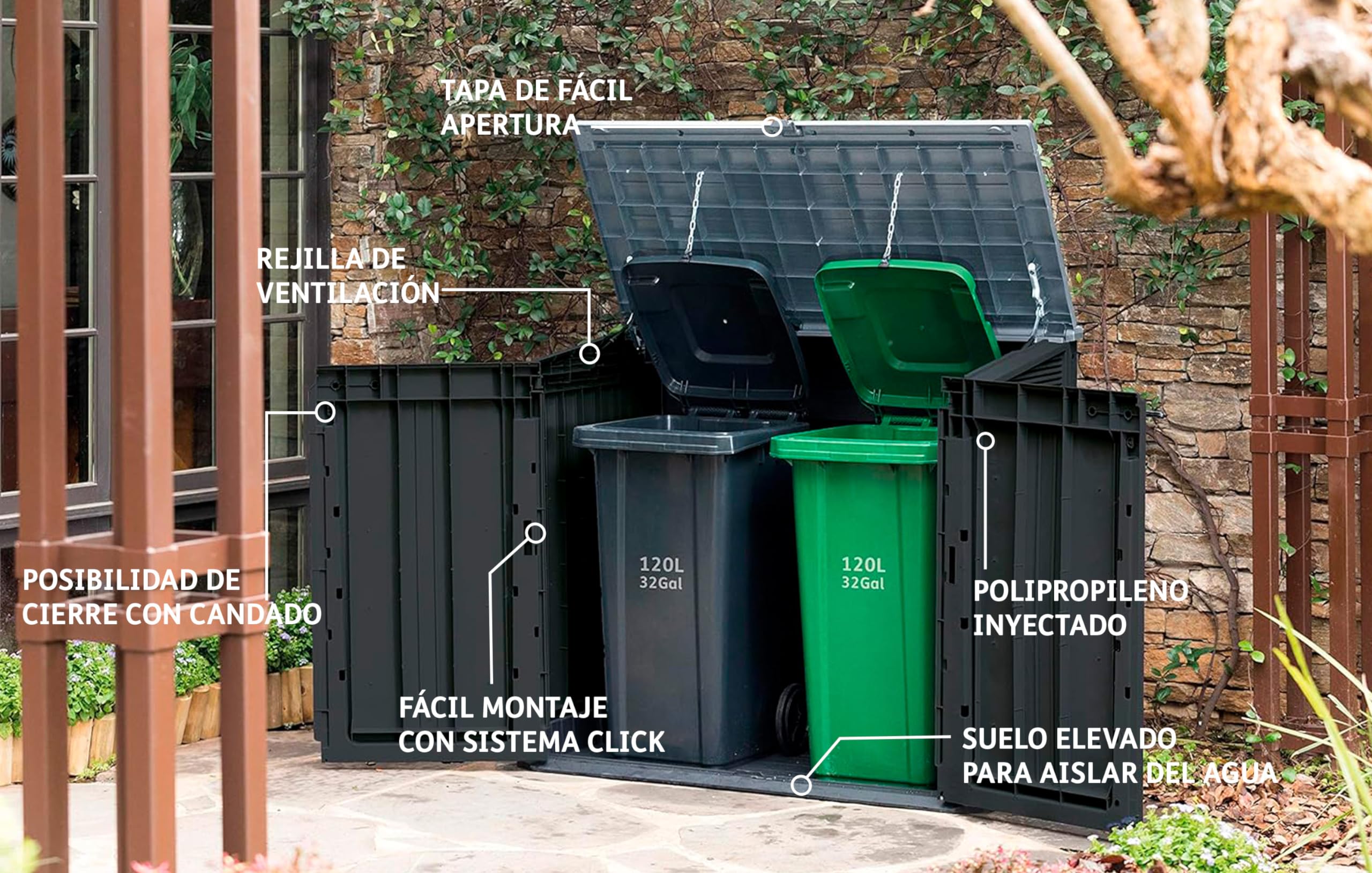 - Ideal outdoor storage solution for garden tools and equipment, BBQ and accessories and x2 120L wheelie bins