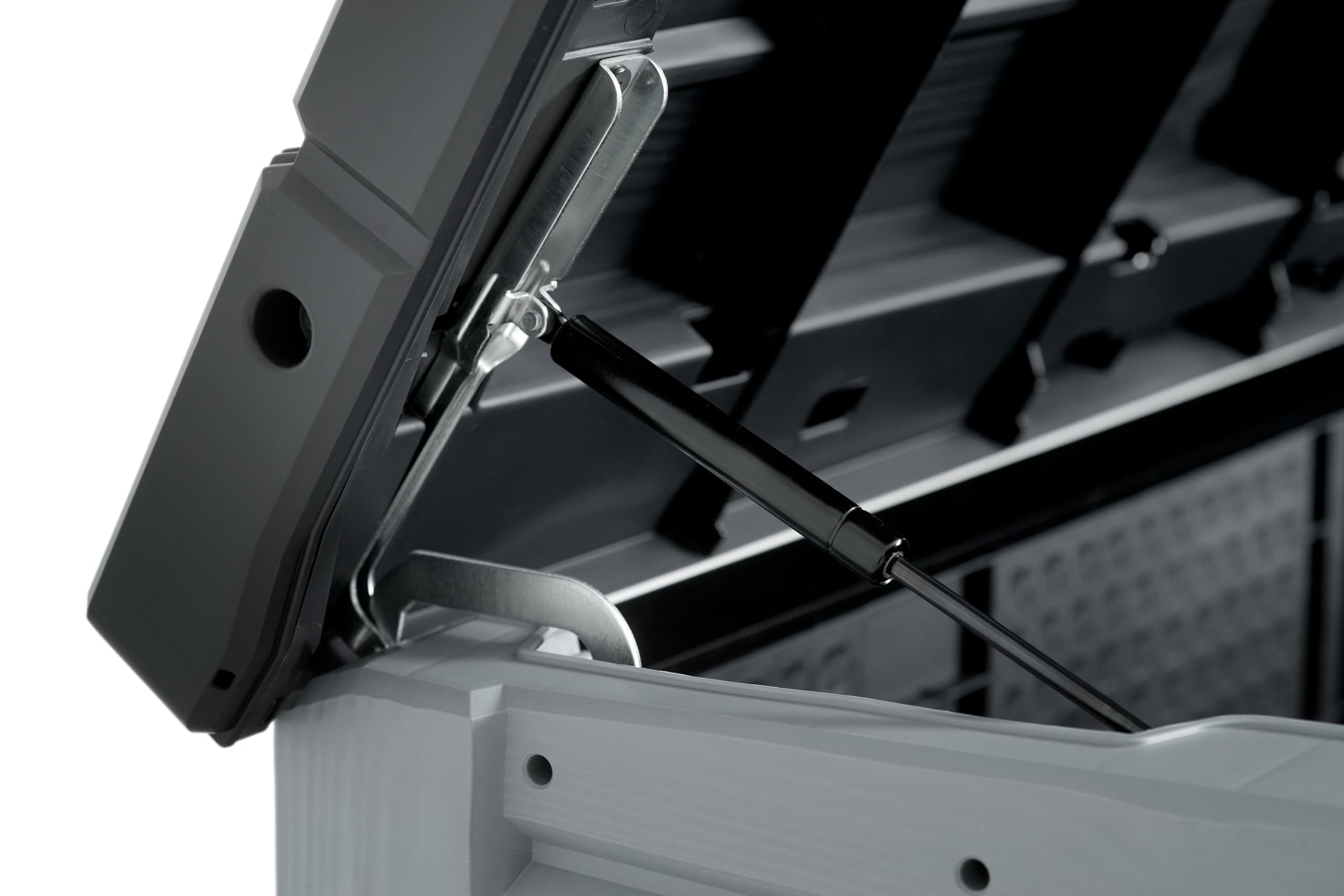 • Hinged lid (with gas springs) and 2 front doors, lockable (lock not included)