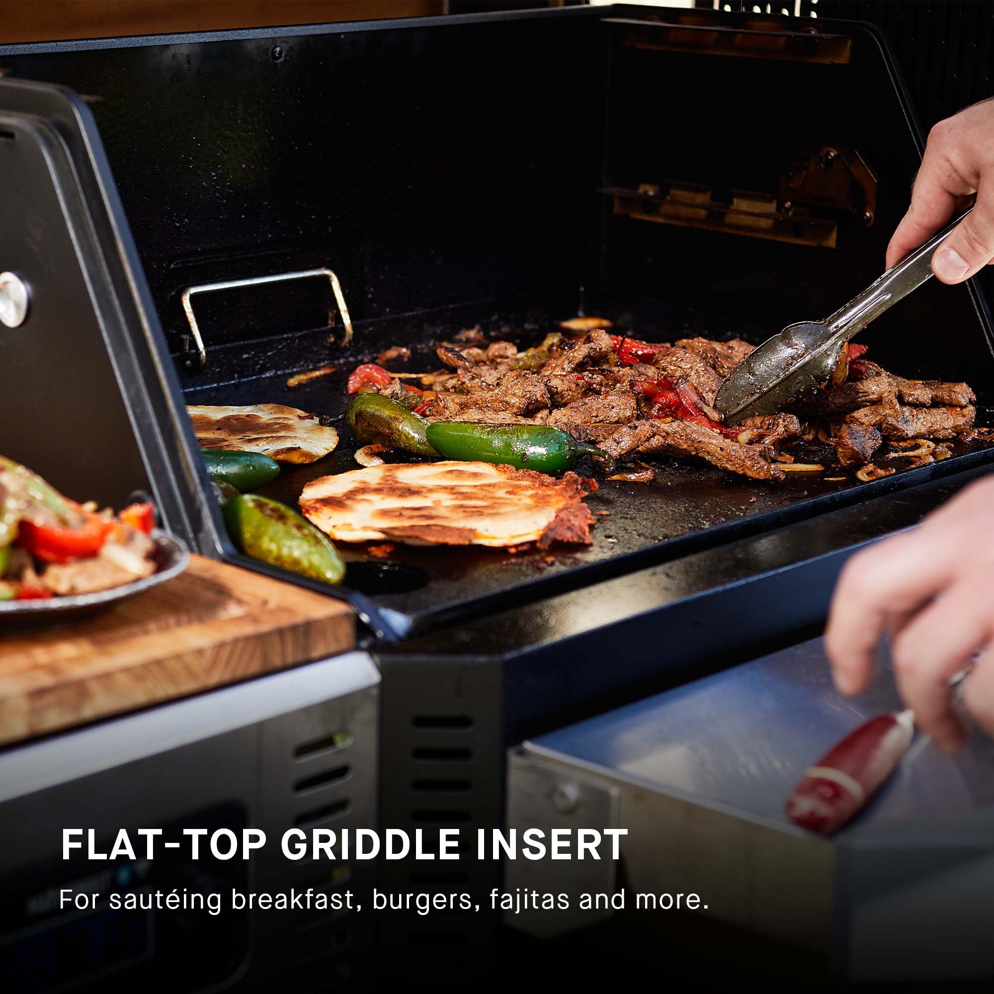 • Includes a flat top griddle insert and cast iron grill grates with 800 total square inches of cooking area (including the two porcelain-coated smoking racks)