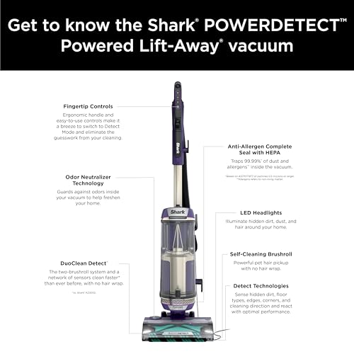 Details: The Shark POWERDETECT upright vacuum combines the most powerful suction, ultra-powerful hair pick-up and Shark’s most advanced cleaning technology to deliver the best overall cleaning of any vacuum*. It features the new DuoClean Detect nozzle which includes two brushrolls and a network of proprietary sensors that automatically sense and react to hidden dirt by boosting suction and brushroll speed when you need it most across floor type, corners, edges, and it even detects direction for powerful suction in forward and reverse to grip and capture more dirt, debris & hair than the original DuoClean nozzle. Large piles, fine dust, and & pet hair are no match for DuoClean Detect. Shark’s Odor Neutralizer Technology guards against bad odors inside your vacuum to help freshen your home. Plus, Anti-Allergen Complete Seal with HEPA filtration seals and traps 99.99%** of dust, dander, and allergens*** inside of the vacuum, and out of the air you breathe. For above-floor cleaning, you can Lift Away the detachable pod and take your cleaning to stairs, furniture, windowsills, and more. In addition, when you lift away the pod, you transform your vacuum into a stick, for easy motorized cleaning under furniture. *Based on a geomean of combined tests -IEC62885-2 Sec 5.3 FWD, IEC62885-2 Sec 5.3 REV, IEC62885-2 Sec 5.5 FWD, IEC62885 Sec 5.5 REV vs. upright market” **Based on ASTM F1977, down to .3 microns. ***Allergens refers to non-living matters.