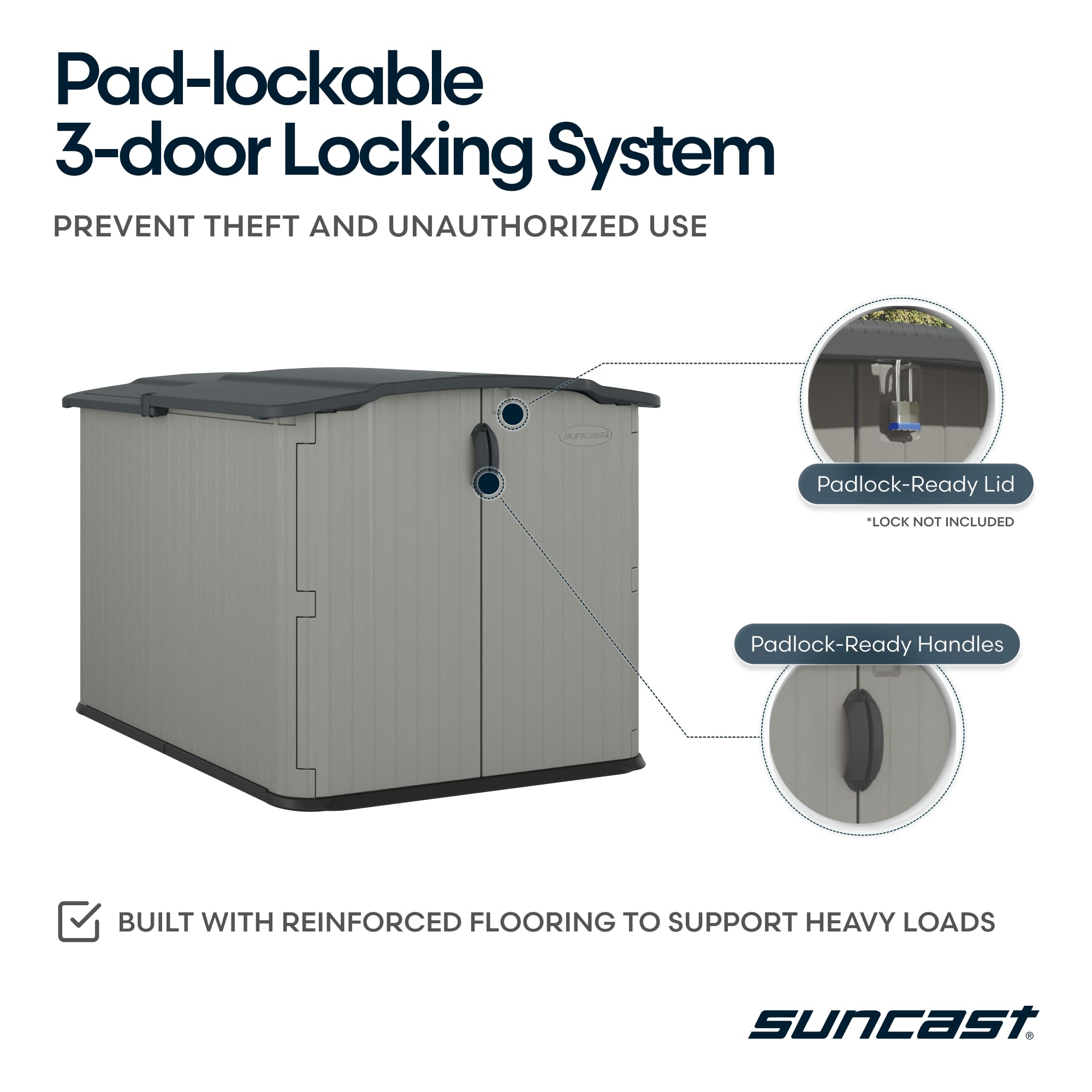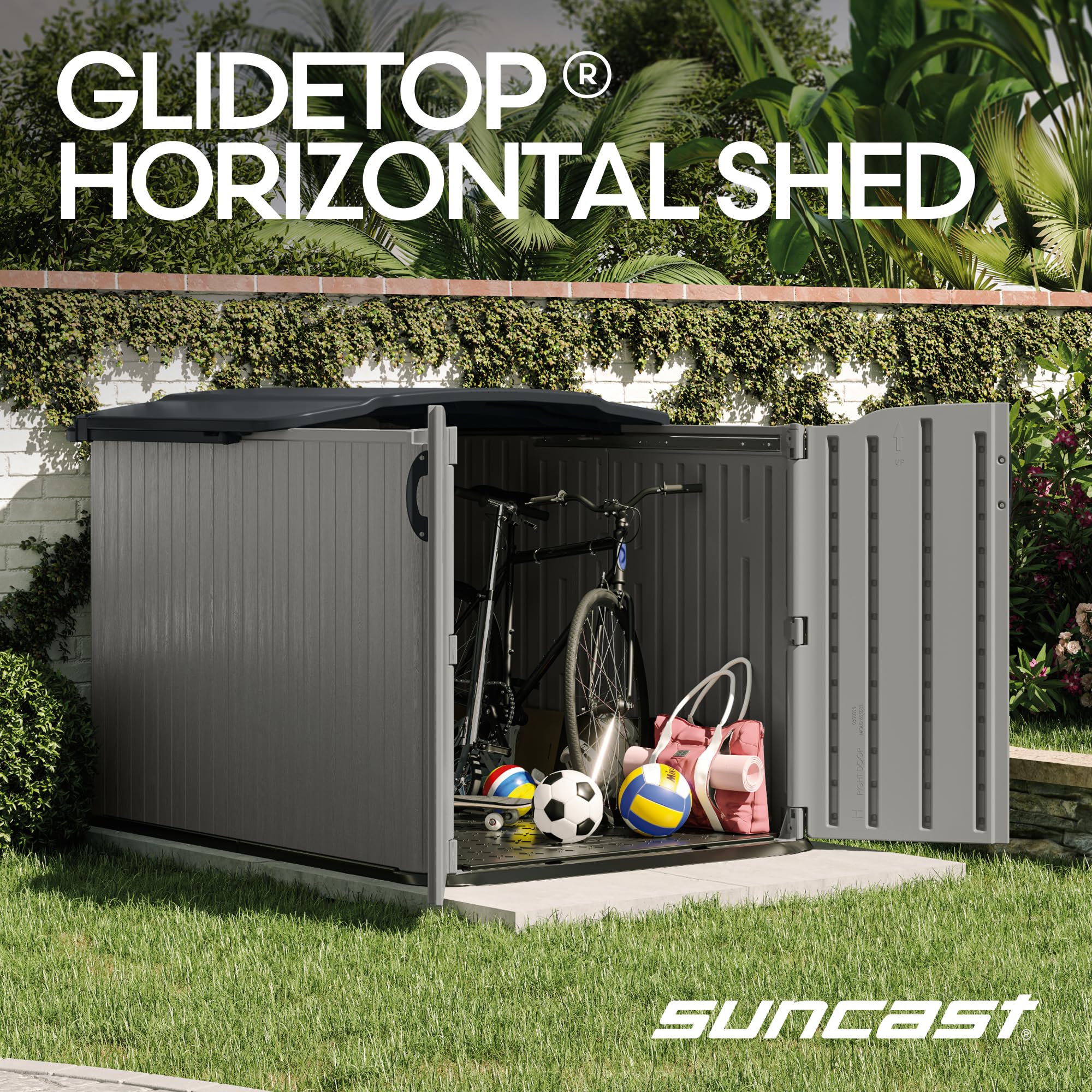 - EASY ACCESS GLIDETOP LID. This outdoor storage shed with floor features Suncast’s signature Glidetop sliding lid that opens effortlessly for fast, full access to all contents, so no awkward lifting required. A perfect fit for high-use storage zones.